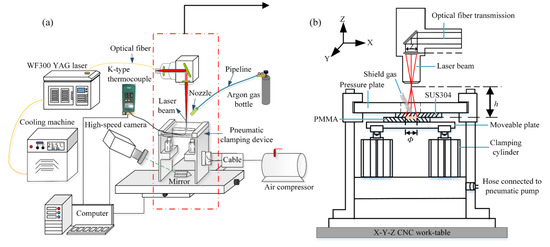 The laser welding of the dissimilar 304 austenitic stainless steel and PMMA materials was carried out with a WF300 YAG laser (wavelength: 1064 nm, focal length: 15 mm, pulse duration range: 0.1–50 ms, incident beam diameter: 40 mm and laser defocus: 100 mm). Figure 1a shows the experimental apparatus of the laser that was used to join the PMMA and steel.