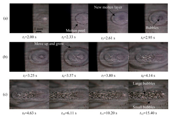 High-speed camera images of the bubble formation and movement. (a) Formed molten pool and bubbles, (b) Growth of the molten layer and bubbles fluctuated, (c) Solidification process.