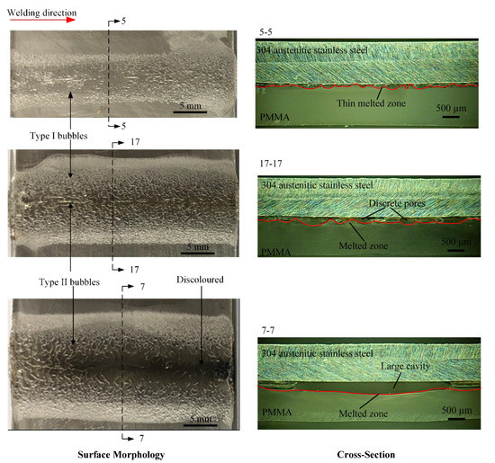 Typical surface morphologies and macrostructural cross-sections of the PMMA–steel joints for different laser parameters are shown in Figure 6. There are a large number of bubbles in these melted and solidified zones for the three typical morphologies (the area where the PMMA was melted is marked by the red line). The surface morphology of NO.5 was a sound weld sample, where the bubbles’ sizes were relatively small and they were distributed throughout the bonding interface (type I bubbles) and the PMMA–steel sheets were connected tightly near the boundary of the molten zone. The surface morphology of NO.17 had some mesh bubbles (type II bubbles) concentrated in the central area of the melted zone and discrete large pores were observed in the cross-section. The mesh bubbles in the center of the weld were surrounded by smaller bubbles. Discoloration occurred on the surface morphology of NO.7. A continuous large cavity was formed in the center of the cross-section and the decomposition of PMMA was also observed at the joint interface. Therefore, it could be concluded that type I bubbles were generated under all the laser energy input conditions tested. The mesh bubbles and cavities that were formed, together with the decomposition of PMMA throughout the joint interface, greatly reduced the effective bonding connection area.
