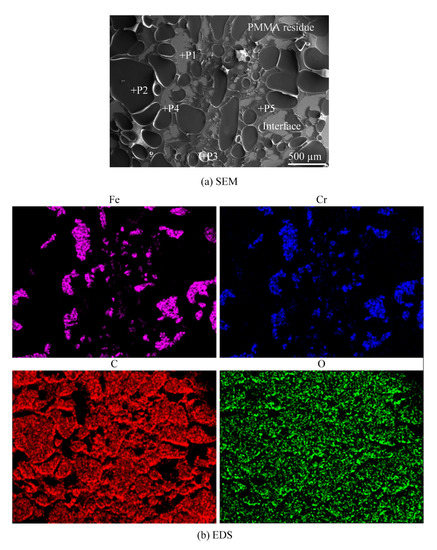 Typical tensile shear fracture surfaces of the PMMA-steel joints are shown in Figure 10. It was found that there were residual materials on the fractured side of the 304 austenitic stainless steel. These residual materials might have been PMMA plastic. To further investigate the residual materials, Figure 10 indicates the typical SEM–EDS analytical results of the 304 austenitic stainless steel fracture surfaces. The SEM–EDS analysis showed that the residual materials contained two modes of morphologies with carbon elements (marked near P2, P3 and P5 in Figure 10a,b). The first mode of residual PMMA on the surface of the 304 austenitic stainless steel side fracture (marked near P5 in Figure 10a presented an irregular shape with deformation characteristics, indicating that this PMMA must have been deformed in the tensile shear test. This shows that the 304 austenitic stainless steel and PMMA must have been combined through a strong bond such that the deformation occurred on the PMMA side close to the interface. The second mode was circular or elliptical, similar to the bubble shape (marked near P2 and P3 in Figure 10a), which indicates that the bubble may have acted as a fracture site. It can be seen from Figure 10a that the fracture morphologies of the PMMA–steel joints demonstrated a mixed failure.