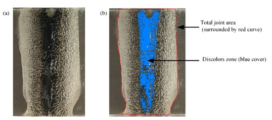Example of joint NO.11 to display the ImageJ measurement in the discolored zone: (a) image of joint NO.11 before the ImageJ analysis and (b) image of joint NO.11 after the ImageJ analysis.