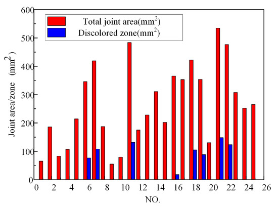 Orthogonal experimental design results of the 25 conditions: measured total joint area and discolored zone.