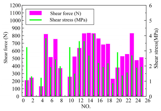 Orthogonal experimental design result of the 25 conditions: measured shear force and calculated tensile shear stress.