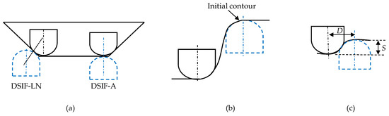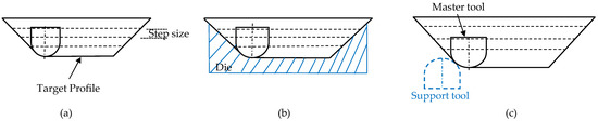 In DSIF, a flexible support tool is used, which can change its position regarding the master tool. Based on this flexibility, many tool configurations are derived. The two tool configurations based on local support to the master tools are: aligned (DSIF-A) and normal (DSIF-LN) (Figure 4a). In DSIF-A, the tool axes are parallel and on the same line. In the DSIF-LN configuration, the tool-tip centers are along the local normal at the contact point of the sheet [23]. Due to the support tool’s ineffective utilization at the component opening, the DSIF-A configuration is not frequently used. Therefore, in this work, DSIF-L will refer to DSIF-LN unless otherwise specified. Two other tool configurations based on the support tool locations are DSIF-L and DSIF-P (Figure 4a,b). In DSIF-P, the support tool moves at the part opening to act as a backing plate. It does not take part in the actual forming operation [24]. The support tool coordinates remain fixed at the initial contour, whereas the master tool coordinates are according to the part profile. In ADSIF, Equations (1) and (2) can acquire the support tool coordinates. However, in most cases in the previous studies, the support tool position is determined based on adjusting the parameters and values iteratively with respect to the master tool (Figure 4c) [21,25].