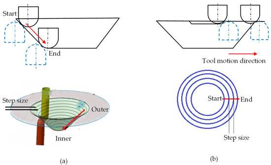 The toolpath strategy categorizes DSIF into conventional-DSIF (DSIF) and accumulative-DSIF (ADSIF). In ADSIF (Figure 2b), both tools move horizontally outward to form the components. The already processed inner material moves downward by rigid body motion [20,21]. In DSIF, the tools’ downward movement from the outer toward the inner annulus obtains the required profile. The part profile is obtained from the synchronized movement of tools via in-plane and normal to the in-plane direction such as in the SPIF process (Figure 2a).