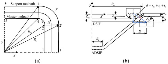 where, is the distance between the axis of the two tools in the XY plane; is the vertical distance between the bottom of the sheet and the tip of the support tool in the XZ plane; and are the master and support tool position in the XZ plane; and is the master and support tool position in the XY plane. In DSIF, parameters and are determined by utilizing the sine law and the normal tool configuration. From Figure 3b, it is evident that , and , where and is the master and support tool radius, is the local wall angle, and is original sheet thickness. The and should change continuously as part height increases due to the dependence on the sheet thickness at the contact point () (Figure 3b). Due to sine law limitations, they are mostly held constant after the initial setup at the first contour.