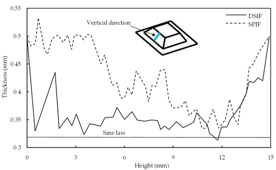 Otsu et al. [29] compared the sheet thickness distribution for SPIF and DSIF-L. SPIF does not observe the sheet thickness variation at the part opening due to global bending effects. In DSIF, the variation in sheet thickness is started from the beginning (Figure 5). It was attributed to the strong restraint on the sheet by the tools from both sides. The wall thickness predicted by sine law was 0.32 mm. As evident from Figure 5, the thickness acquired with DSIF-L is relatively closer to the sine law prediction along the complete section; however, it does not match the thickness predicted by the sine law.