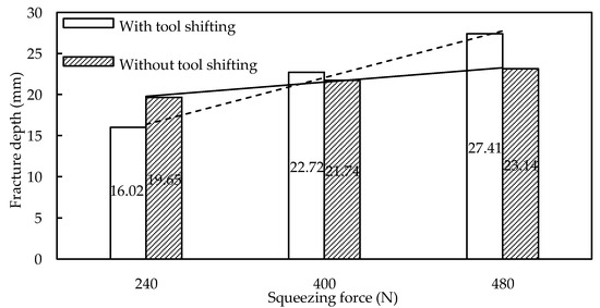 Because of the increased compressive force provided by the support tool, it is usually assumed that the DSIF has higher formability than the SPIF. The support tool must maintain constant contact with the sheet to benefit from the compressive force. Meier et al. [37] utilized the support tool with 300 N force in the DSIF-L orientation to ensure the support tool–sheet contact and reported a wall angle of 72° for the hyperboloid component. An earlier study in SPIF could not acquire a wall angle of more than 65°. The support tool force helped in increasing the formability by 12.5%. According to Malhotra et al. [26], the DSIF toolpath improves precision and formability by stabilizing distortion within a narrow zone surrounding the tool’s contact site. B. Lu et al. [38] observed the evolution of fracture depth in AA7075-T6 with varying squeezing force. For squeezing force less than 240 N, there is no significant change in the fracture depth, and the tool squeezing does not make any apparent effect. Squeezing force from 240 to 480 N increases the formability from 20 to 30 mm. Increasing the squeezing force to 560 N harms the fracture depth (Figure 6). It was analytically proved by a sudden drop in stress triaxiality point for stresses in the 240–480 N range. As illustrated in Figure 7, the forces in this range were observed for various support tool adjustments (without tool shifting is DSIF-L orientation, whereas with tool shift is support tool adjustment in the middle position between DSIF-L and DSIF-A). The increasing squeezing force with tool shift adjustments positively impacts formability improvement than the other tool adjustments. The fracture occurred in both cases in the sheet region, which was in contact with a master tool, emphasizing the relevance of the support tool in delaying the fracture. Under excessive-high contact pressure and high friction, the tools may “clamp” and “stretch” the sheet in the moving direction, leading to high tensile stress conditions around the deformation zone and early failure of the sheet.