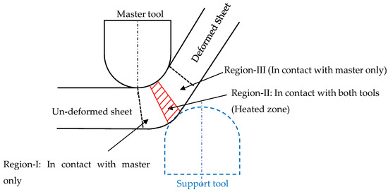 Valoppi et al. [39] utilized the analytical model proposed by B. Lu et al. [38] to investigate the fracture characteristics of Ti6Al4V sheets in the electric-assisted DSIF (E-DSIF) process. The deformation region was divided into three zones (Region-I, II, and III) to investigate the relationship between the E-DSIF fracture surfaces and the stress state (Figure 8). Region-I and III experience meridional tensile stresses, and Region-II experience compressive stresses due to support tool squeezing. They reported that the outer Region-III is more susceptible to fracture due to reduced radial thickness, local bending, more circumferential stress due to tool movement in that direction. It was further exaggerated by current, which increased through the thickness-shear too.