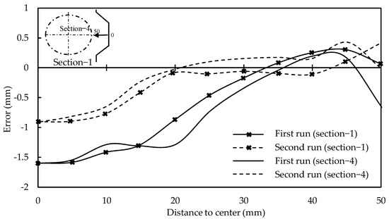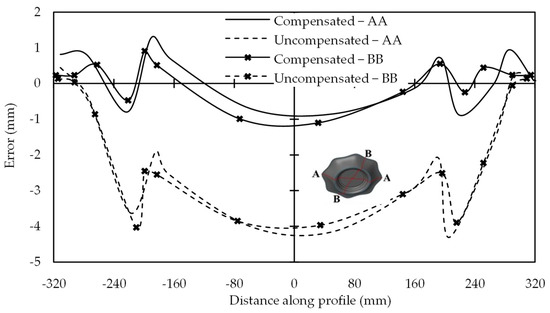 Error along section AA and BB for the feature of free-form geometry with 610 mm opening (reprinted with permission from Praveen et al. [52], Copyright 2020 Elsevier).