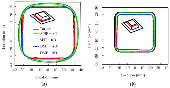 Horizontal cross-sectional shapes of formed sheet at different heights; (a) height = 3 mm (b) Height = 12 mm, where AD is advancing (clock-wise) direction, RD is retreating (anti-clockwise) direction (reprinted with permission from Otsu et al. [29], Copyright 2018 Elsevier).