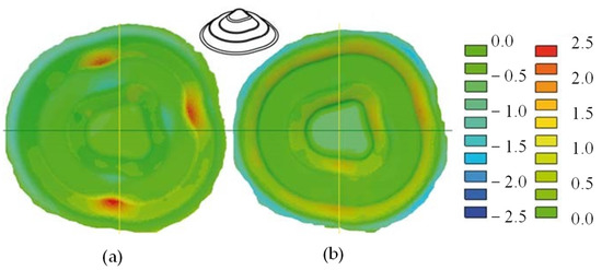 Lingam et al. [23,51] incorporated sheet and tool deflections compensation in the DSIF toolpath and formed components such as cone, funnel, and parabolic. Geometric precision improved both at the wall and the bottom region. The strategy has some limitations (i) it works well for fixture symmetry (ii) deflections should be small compared to sheet thickness, which limits it for a part size up to 200 × 200 mm. Membrane forces experienced by the middle plane of the sheet due to stretching resist the applied transverse load as the sheet deflection increases beyond its thickness. Praveen et al. [52] utilized a combination of small deflection earlier used by Lingam [23,51] and membrane theories to predict and compensate sheet deflections for small and large components. An effective empirical model was developed to estimate large-size components’ sheet and tool deflection. The model was verified by forming geometries such as varying wall angle axisymmetric and a free-form component with a maximum opening size of 610 mm. A compensated toolpath reduced the average error to less than 0.80 mm (Figure 13). Although the accuracy enhanced significantly; however, the support tool did not maintain contact throughout the process due to machine compliances error. The machine tool elements traverse large distances while forming large components; thus, the possibility for an increase in the magnitude of machine tool errors also increases. Konka et al. [53] compensated machine error in the toolpath based on the grid-based method along with the tool and sheet deflection errors. Average accuracy improved further to less than ±0.5 mm. In addition, the support tool had maintained contact with the component throughout the process.