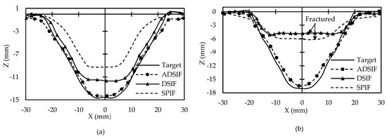 Malhotra et al. [31] introduced a novel ADSIF toolpath strategy to maintain a successful contact between the tool and the sheet. ADSIF and DSIF were compared for cone profiles having 40° and 50° wall angles. Other parameters such as material (AA2024), sheet thickness (0.5 mm), tool diameters, step size (0.025 mm) were kept constant. ADSIF gives better geometric accuracy. DSIF could not form the part with a 50° wall angle as the part fractured earlier (Figure 16). ADSIF faces two challenges (i) better geometric accuracy is obtainable with low step size only (ii) Unlike out-to-in DSIF, the component shape in ADSIF is not directly acquired by the motion of the tools. It is obtained by the accumulation of previous rigid body deformations. The relationship between the desired shape and toolpath parameters is not apparent. For optimal parameters determination, trial and error experimentation is required. Both these limitations make the process time-consuming.
