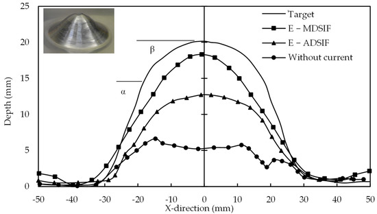 Hybrid-EDSIF, E-DSIF, and E-SPIF (E is for electric) were used to form a cone from AZ3B1. In hybrid E-DSIF, for the fillet region at the part opening, the toolpath mode was DSIF-P. After deforming the fillet, the toolpath mode switched to DSIF-L. Minimum springback was observed in part formed with HE-DSIF. Its geometric accuracy improved significantly as the average error was less than 1 mm (Figure 18). Their work compared the error after unclamping and trimming, although the geometric error during forming took the most significant error percentage. Geometric error in the part after unclamping and trimming could decrease with E-DSIF. They also pointed out that the materials with more significant electrical resistance will be energy efficient in the E-DSIF [78].