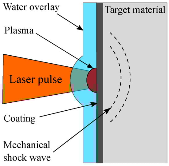 Within this study, LSP is investigated. It has been described as a process where short laser pulses with a high intensity are used to vaporize the surface layer of a target material or a coating. This vapor is turned into a high-temperature [5] and high-pressure plasma [6], which induces a mechanical shock wave within the material during its expansion; see Figure 1. The propagating shock waves cause local plastic deformation, which results in residual stresses (RS) in the target material [3]. For instance, due to the higher and deeper penetration depth of compressive RS, LSP is a potential substitute for conventional shot peening processes [7].