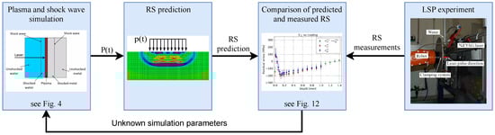 Schematic of the applied LSP simulation scheme, including the comparison of predicted and experimentally determined RS. The global LSP model yields the plasma pressure. This pressure is used in FE simulations to determine the RS numerically. The predicted RS are compared with measurements to determine unknown plasma parameters for the case of a 5 J energy pulse without coating. Based on this, the global model is adjusted to allow for predictions of RS state at different laser intensities and coating materials.