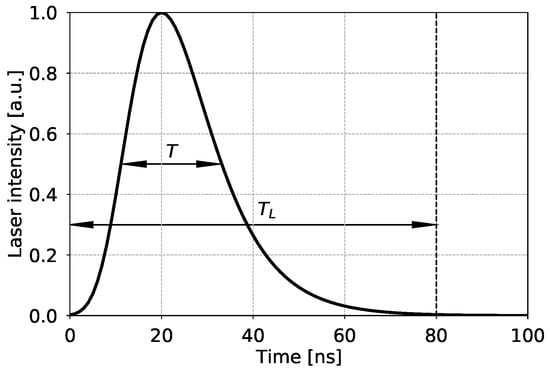 In this work, experiments were performed with an Nd:YAG laser (Quantel Laser by Lumibird, Les Ulis, France) with a wavelength of 1064 nm. Laser pulse energies of 3 J and 5 J with the full-width-at-half-maximum (FWHM) of and a square laser focus with a size of were used. Laser pulses were applied with the frequency of 10 Hz. As shown in Figure 3, the used laser provides a non-symmetric temporal profile with the total pulse duration of 80 ns. The spatial laser intensity distribution is almost constant over the square spot.