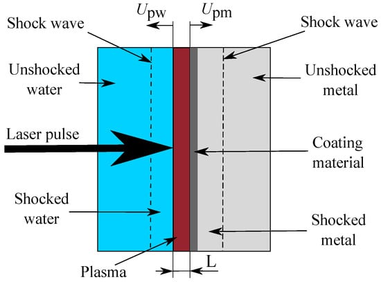 and represent the expansion speed of the plasma in the water and metal directions, respectively; see Figure 4. and are the plasma pressure and density, respectively, and is the coating layer density. The mass balance of the plasma reads as follows: