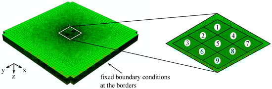 An FE model is used to simulate the mechanical shock wave propagation within a target material. The aim of the FE simulation is the prediction of the resulting RS after the LSP treatment, based on the pressure pulse obtained from the global model. The LSP process model follows the set-up presented by Keller et al. [41] and the FE analysis was performed with ABAQUS (Dassault Systèms, Vèlizy-Villacoublay, France). Continuum elements (C3D8R) with an approximate element size of were used near the laser spot, where the size in depth direction was significantly smaller than parallel to the surface plane. The borders of the FE model were fixed, but the top (target surface) and back surfaces were left unconstrained, simulating free surfaces; see Figure 5. Note that possible reflections of the mechanical stress wave at the back surface were assumed to not affect the resulting RS, as demonstrated in Keller et al. [41]. Laser impacts were simulated as pressure loadings acting locally on the target surface. The time-dependent pressure loading was assumed to be spatially constant, as the experimental spatial laser intensity distribution was almost constant [41].