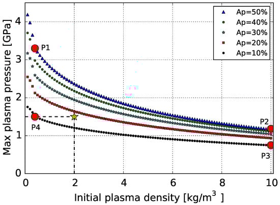 Sensitivity analysis of the maximum plasma pressure dependent on initial plasma density for different absorption coefficients . LSP of aluminum with a laser pulse energy of 5 J without coating is simulated. The points P1, P2, P3 and P4 correspond to the borders of the parameter space and represent pairs of values and , which were used within the sensitivity study. The star corresponds to identified simulation parameters based on the comparison to experimental RS results; see Section 2.3.3.