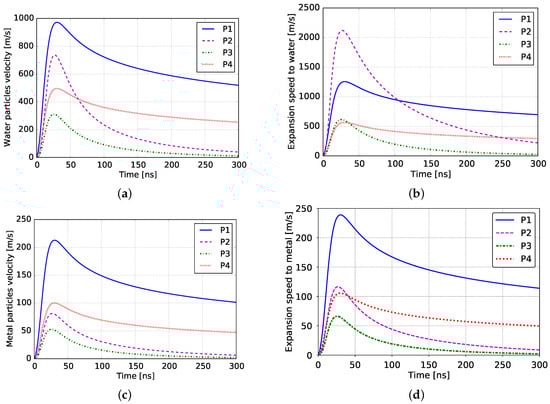 The four points (P1, P2, P3, P4) at the borders of the considered parameter space of and —see Figure 6—were chosen in order to study the plasma and the shock wave behavior in the model in detail. Temporal distributions of water and metal parameters for the first for these four points are shown in Figure 7 and Figure 8. The results for the metal and water shock region illustrate that a higher initial plasma density results in a faster decrease in the particle and plasma expansion velocities after reaching the maximum value. The particle velocity of water is approximately five times larger than the velocity of metal particles; see Figure 7a,c. The expansion speed of plasma in the direction of water is one order higher than the expansion speed in the direction of metal; see Figure 7b,d.
