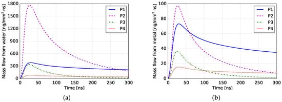Time-dependent mass flows from water region (a) and metal region (b) to plasma for the four border points P1–P4; see Figure 6. The major mass flow from water indicates that the plasma mostly consists of water particles.