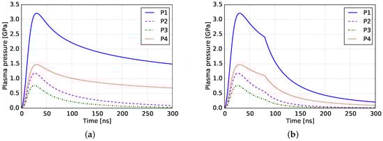 Plasma pressure distributions for the four border points P1–P4 defined in Figure 6 without relaxation (a) and with relaxation (b), which happens after laser pulse terminates and results in a pressure drop.