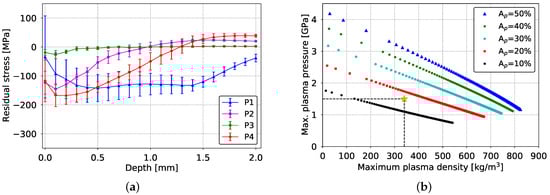 In the next step, the determined pressure pulses are applied as surface loading in the FE simulations to predict residual stresses in the target material, as described in Section 2.2.2. The resulting RS for the four parameter combinations are depicted in Figure 10a. Depending on the specific pressure profile, the RS distributions show different behavior. The largest pressure produces compressive RS with a maximum value less than over a depth between and . In contrast to this, the lowest pressure P3 causes a shock wave, which does not even exceed the yield stress at a depth of . An increase in the maximum pressure leads to an increase in the maximum compressive RS, up to a saturated value. After this value is reached, the further increase in the maximum pressure leads more to a shift in the position of the maximum RS together with a slight decrease and a more uniform over-the-depth stress distribution.