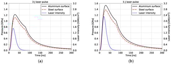 Temporal pressure distributions for the cases with aluminum ablative surface (solid black line) and with steel foil as a coating material (dashed-dotted red line) in comparison with laser intensity profiles (dashed blue line) for laser pulse energy of 3 J (a) and 5 J (b).