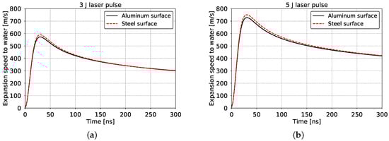 Temporal distribution of the expansion speed of plasma in water direction for the cases with aluminum ablative surface (solid black line) and with steel foil as a coating material (red line) for laser pulse energy of 3 (a) and 5 J (b).