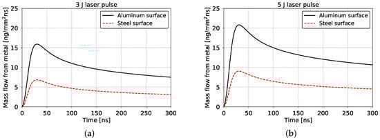 Time-dependent mass flows from metal to plasma for the cases with aluminum ablative surface (solid black line) and with steel foil as a coating material (red line) for laser pulse energy of 3 (a) and 5 J (b).