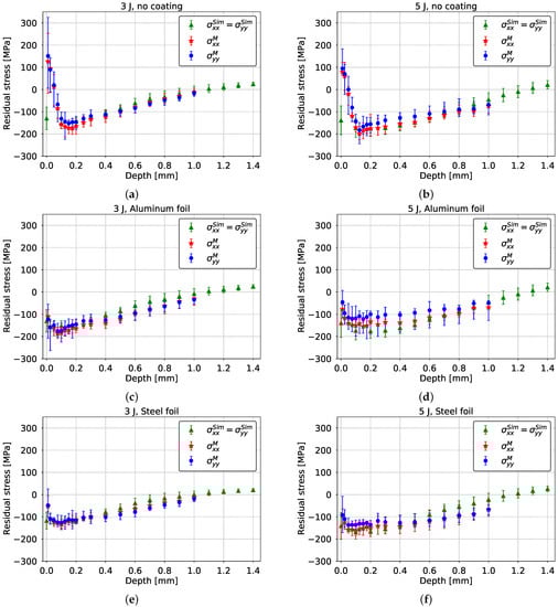 The simulated RS for without foil are in good agreement with the experimental RS determination, which demonstrates the applicability of the identified plasma parameter for laser pulses also in the case. Experiments show that the application of an aluminum coating leads to a higher maximum compressive stress and indicate a slightly deeper penetration of compressive RS compared to LSP without coating; see Figure 14a,c for 3 J and Figure 14b,d for 5 J. This observation is consistent with the literature [54]. The corresponding simulation result shows some disagreement with the experimental data, probably due to the fact that the global model does not take into account the effect of the interface between the foil and target material (AA2198). In the case of the steel ablative coating, the predicted RS are in good agreement with the experimental results. This shows that the reduced plasma pressure, as depicted in Figure 11, causes a reduced penetration depth and reduced compressive stresses, although the predicted penetration depth is slightly underestimated.