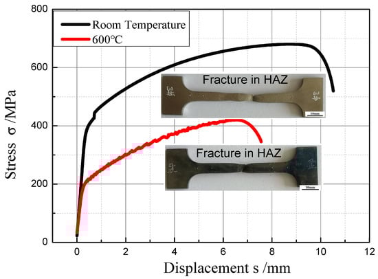 A 6.5 mm thick X9CrNiSiNCe21-11-2 austenitic stainless steel plate, named modified 310S, was used as the base metal (BM) to produce welded joints via PAW. The filler material was 25Cr-20Ni welding wires, with a diameter of 1.2 mm. The 310S billets were reheated to 1200 °C for 60 min, hot rolled from 50 mm to a 6.5 mm thick plate. The heat-treatment solution condition of the plate is 1050 °C for 20 min, followed by final water quenching. Specimens for the creep rupture test were taken from the plates parallel to the rolling direction. The main chemical compositions of the BM and filler materials are listed in Table 1. PAW procedure was performed by single-layer and single-pass techniques with I-groove and no gap. The welding current was 160 A, welding voltage was 25 V, and the welding speed was 15 mm/s. The 310S welded joint was extracted from a mockup of the welded plate. The 310S welded joint without phase transformation strengthening, and the curing container is not easy to achieve for post weld heat treatment (PWHT). Therefore, the welded joint did not use PWHT in this work. The microstructures are shown in Figure 1. The vermicular ferrite was inserted at the dendritic grain boundaries of the austenite matrix, as shown in Figure 1a. However, the heat affected zone (HAZ) has an obvious border produced by the immense influence of the welding thermal cycle, as shown in Figure 1b. The isometric austenite matrix is shown in Figure 1c. The metallographic differences will manifest different creep resistances. The uniaxial tensile tests were conducted by the SANS-CMT machine (CTMI Co., Ltd, Shenzhen, China). The samples were tested with tensile displacement rates ranging from 0.2 mm/min to 2 mm/min at room temperature and 600 °C. Figure 2 shows that serrations appeared in the stress–deformation curve of the welded joints at 600 °C, indicating that the welded joints experienced dynamic strain aging at this temperature. The values of tensile strength and yield strength were 660 ± 20 MPa and 350 ± 10 MPa at room temperature, and 410 ± 20 MPa and 200 ± 10 MPa at 600 °C, respectively.