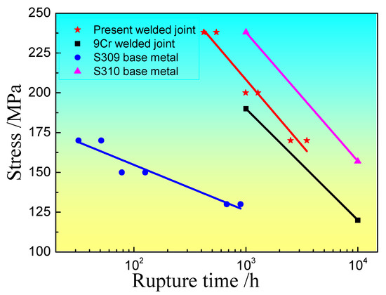 Creep rupture of the welded joints at 600 °C including 9Cr welded joint [], S309 base metal [] and S310 base metal [].