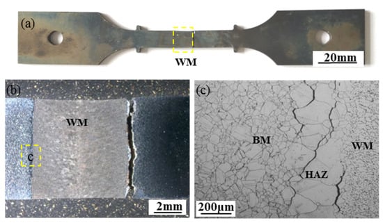 Creep rupture tests were further conducted at 600 °C under stresses of 238 MPa and 170 MPa, respectively. After the creep tests, the creep lives were determined to be 430 h and 3504 h, respectively. Figure 4 shows the macroscopic and microscopic profiles of the 310S weld after creep rupture. The fracture location is visible in the HAZ of the welded joints. In the rupture specimen, creep deformation and necking phenomena were not observed under the stress of 238 MPa, as shown in Figure 4a,b. To reveal the cracking evolution during the creep process, the microstructure of the creep fracture is shown in Figure 4c. It can be seen that many secondary cracks appear in the HAZ, which should be responsible for the creep rupture. Cracking is generated from the micro-cracks that form along the austenite grain boundaries, and its direction tends to be perpendicular to the loading direction, as shown in Figure 4c.