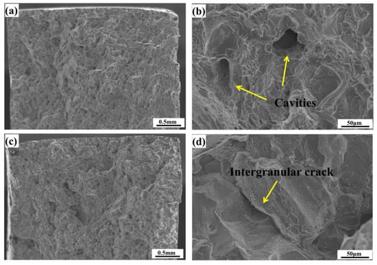 Long term service at a high temperature induces stress relaxation cracking (SRC) in the heat affected zone of the austenitic stainless steel []. Figure 5 shows the fracture morphologies of two creeps rupture specimens at 600 °C under 238 MPa and 170 MPa, as observed by SEM. Figure 5a shows the macro-profile of the specimen under 238 MPa for 430 h. A large cavity is observed on the fracture in Figure 5b. The cavities are apt to form cracks and accelerate the cracking during creep. Few dimples are found around the cavities, and it can be concluded that the fracture is mixed type under 238 MPa. Figure 5c,d present the fracture features of the long-term specimen subjected to 170 MPa for 3504 h. The fracture has a smooth edge and gray particles adhere to its surface. The fracture type is estimated as mixed type fracture with less ductility. Intergranular cracks could be found on the fracture of the long term creep specimen. It was reported that cracks are easier to initiate and propagate along the noncoherent M23C6/γ interface []. Consequently, the cracks grew and coalesced to form intergranular cracking under the creep service.