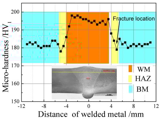 Given that creep cracking is dominated by stress, failure should occur in the lower-resistance creep section. In general, the hardness value is positively correlated with the resistance to plastic deformation []. Figure 6 illustrates the micro-hardness results of the welded joint. It can be seen that the micro-hardness value gradually decreases as the distance increases from the WM center. The maximum micro-hardness value of 198 HV appears in the WM. As the distance increases, the micro-hardness decreases from the WM center, while the HAZ presents the lowest micro-hardness value of 178 HV. Compared with the micro-hardness of the welded joint, the fracture location is considered as HAZ.