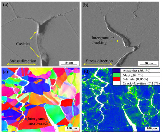 In order to better understand crack initiation and propagation in the 310S welded joint, the microstructure near the creep fracture is shown in Figure 7. It can be seen from Figure 7a that some cavities are distributed along the grain boundaries, especially at triple points, where the stress concentration is bound to emerge. As shown in Figure 7c, the cracks are typically intergranular micro-cracks. Moreover, there are abundant brittle phases of M23C6 and δ-ferrite along the grain boundary, as shown in Figure 7d. It should be noted that the existence of M23C6 and δ-ferrite could deteriorate the creep properties of the welded joints. At the same time, the cavities nucleate around the carbides due to the difference in the deformation resistance between the low-stability M23C6 and the matrix. Upon the initiation of the creep process, the cavities are propagated and extended into cracks along the grain boundary, where they separate from discontinuous M23C6. Finally, the intergranular cracks converge, as shown in Figure 7b.