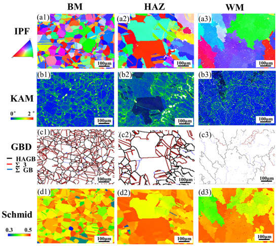EBSD analysis of BM, WM and HAZ for the creep specimen marked in Figure 4a: (a1–a3) inverse pole figure (IPF); (b1–b3) kernel average misorientation (KAM); (c1–c3) grain boundary distribution (GBD); and (d1–d3) Schmid factor.