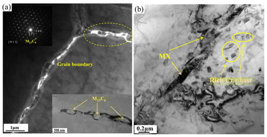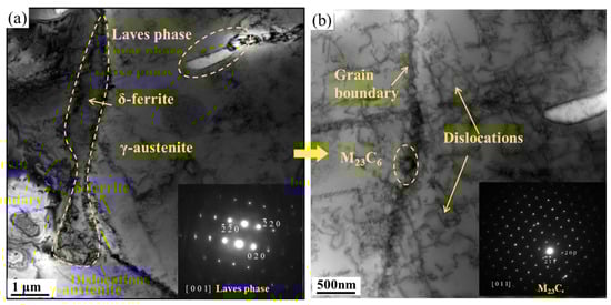 In order to clarify the effect of microstructure evolution on the creep failure behavior, TEM was applied to characterize the δ-ferrite and γ-austenite grain boundaries in the WM, HAZ and BM of the specimens. Figure 9 shows that the grain boundary between δ-ferrite and γ-austenite is discontinuous and decorated with Laves phases in the WM. Furthermore, the details of the boundary show that M23C6 carbides are precipitated along the grain boundary and a great many dislocations are also detected near the grain boundary, which would significantly contribute to dislocation strength. As the filler material has a higher Mo content (0.35 wt.%) than BM (0.05 wt.%), such difference may lead to the formation of Laves phases in WM []. The composition and SAED pattern in Figure 9a also confirmed it was the Laves phase. This means that the accumulation of the Laves phases in WM plays a significant role in precipitation strengthening during the creep process.