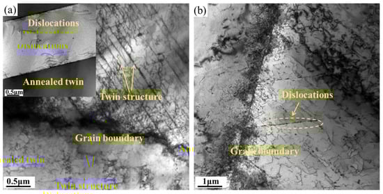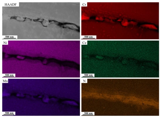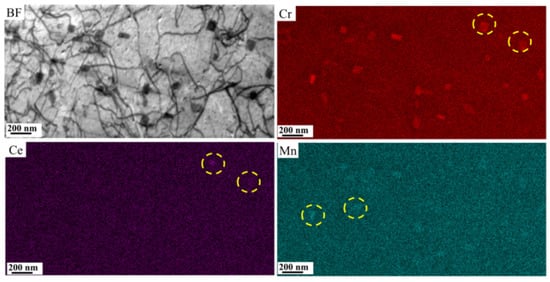 Figure 13 shows representative TEM micrographs of the BM derived from creep samples. It can be observed in Figure 13a that twin microstructures and dislocations are formed around the grain boundaries. On the one hand, low-stacking fault energy metals have great potential to form twin microstructures owing to the deforming and annealing process []. As for low-mobility and low-segregation strengthening alloys, the twin microstructure plays a significant role in affecting the serving properties. On the other hand, due to the crystallographic symmetry, coherent twin boundaries have a strong mechanical strengthening effect without deteriorating other properties []. As shown in Figure 13b, the interaction of the dislocation and Cr-rich phase is evident. As a result, misfitted dislocations around the precipitates and entangled dislocations are also observed in the BM zone. According to the Orowan passing and cutting theory, the dislocation motion is impeded by the second phases, which in turn strengthens the precipitation [,]. Under such conditions, this feature explains the commonly observed Orowan dislocation loop around the second phases, which varies with the content of the second phases. The second phases are not sheared by the dislocation, while the passing mechanism plays a leading role. On the contrary, the cutting mechanism is always dominant if the precipitation is small enough. As shown in Figure 14, the Cr-rich, Ce, and Mn phases are easily observed around the dislocations.