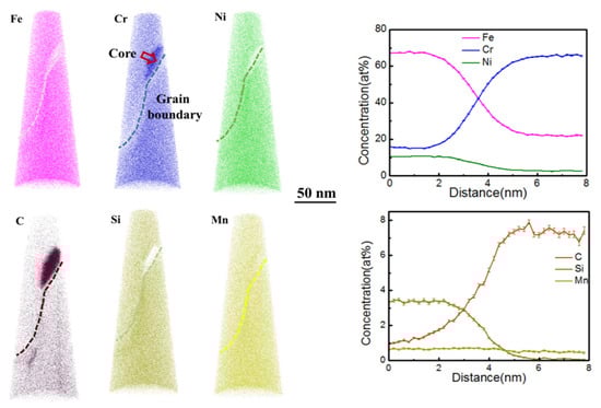 The microstructures were analyzed to clarify the failure location characteristic of HAZ. Figure 10 shows the TEM measurement of the creep sample in the HAZ. It can be seen that more second phases are distributed along the grain boundary of the prior austenite, and especially precipitated in the intersection of the triple grain boundaries. The distribution of elements was also assessed by EDS mapping near the triple grain boundary. As shown in Figure 11, the segregation of Cr, Ni, Ce, Mn and N is visible around the grain boundary. Chemical composition analysis of phases was performed by atom probe tomogram APT. Round rods with a diameter of 500 μm and a length of 15 mm were cut from the HAZ and ground to remove the oxide scale. For the sample subjected to HAZ, the segregation of Cr, C atoms can be clearly observed in the analysis volume from Figure 12. Further, Figure 12 reveals Cr and C-rich cores shells near the grain boundary. The concentration profile indicates peaks of Cr, C concentration, about 64 at.%, 8 at.%, respectively, and poor of Fe, Ni and Si at the core. As expected, brittle phases and element segregations are detected in the triple grain boundary as a result of the high cooling rate in the PAW; however, the formation of these detrimental structures usually leads to crack initiation during the original stage of the creep process. Compared with WM, HAZ enables discrepant deformation in both the heterogeneous coarse grains and the brittle phases, leading to a more regular defect. Besides this, the formation of considerably coarsened M23C6 during long-term creeping is detrimental to the tensile property. Further, with the increase of the in creep time, more cracks accumulate around the brittle phases along the grain boundaries, which eventually lead to creep fracture in the HAZ.