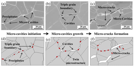 Schematic of the creep rupture behavior: (a,d) micro-cavities nucleation around the triple grain boundary and precipitates; (b,e) micro-cavities growth and coalescence; (c,f) micro-cavities form cracks.