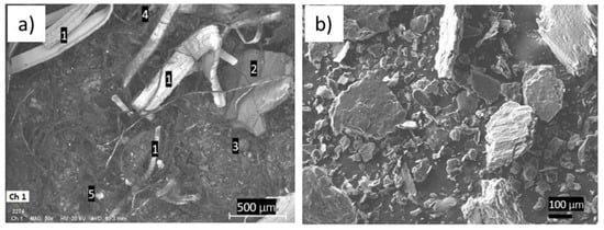 SEM micrographs: (a) reference masterbatch (M0) with some identified constituents (1—steel fibre, 2—vermiculite, 3—aluminium oxide, 4—magnesium oxide and 5—tin sulphide); (b) synthetic graphite particles in the M0_G formulation.