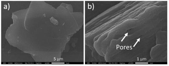 SEM micrographs of gCN powder: (a) image of the typical gCN particle; (b) details of the pores observed on the gCN surface.