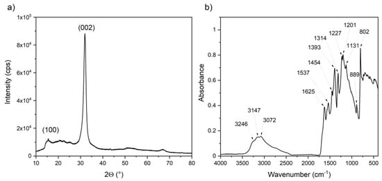 The X-ray diffraction pattern and FTIR spectra of the gCN sample are shown in Figure 3a,b, respectively.