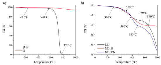 (a) TG curves for components G and gCN and (b) for friction mixtures M0, M0_G and M0_CN.