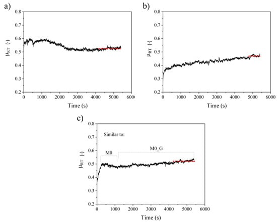 Evolution of the friction coefficient at RT for the (a) M0, (b) M0_G and (c) M0_CN samples. The red, dotted parts of the curves indicate the relevant steady state.