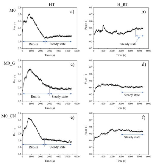 The time evolution of the friction coefficient (µRT) of the M0, M0_G and M0_CN samples tested under RT conditions is shown in Figure 5.