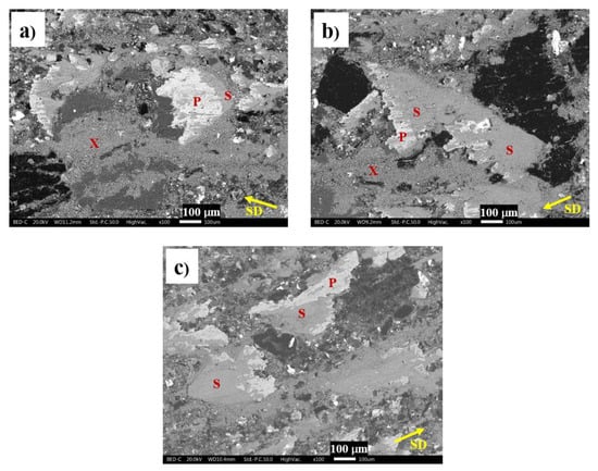 SEM micrographs showing the surfaces of the pins after the PoD tests at RT: (a) M0, (b) M0_G and (c) M0_CN. P—primary plateaus; S—secondary plateaus; X—non-compacted wear particles; SD—sliding direction.